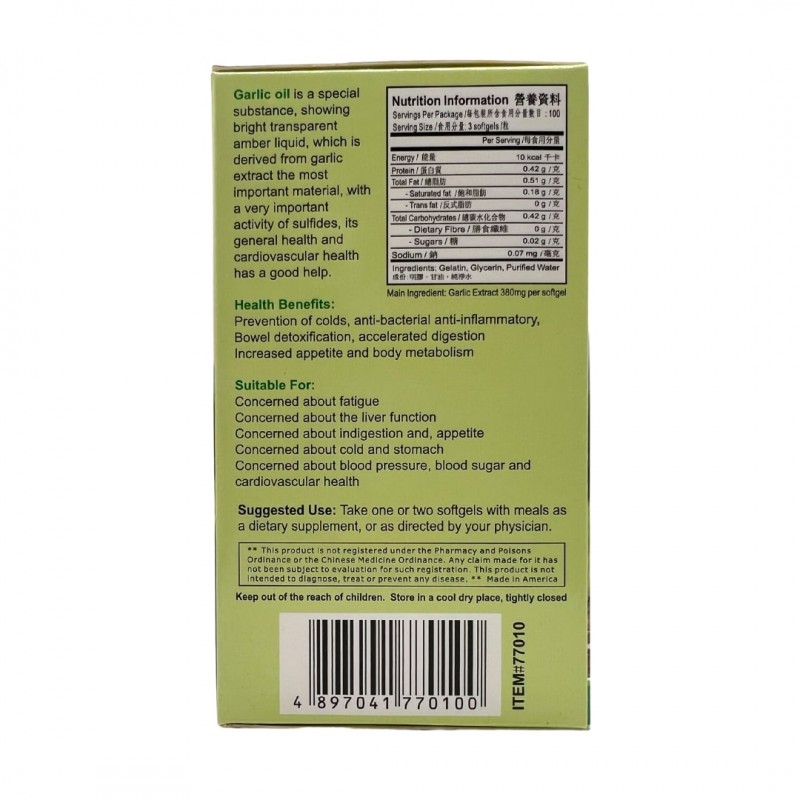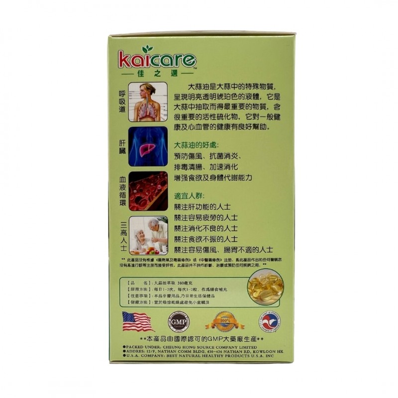 大蒜油是大蒜中的特殊物質,呈現明亮透明琥珀色的液體,它是大蒜中抽取而得最重要的物質,含很重要的活性硫化物,它對一般健康及心血管的健康有良好好幫助。適宜人群:關注肝功能、容易疲勞、消化不良、食慾不振及容易傷風及腸胃不適的人士。