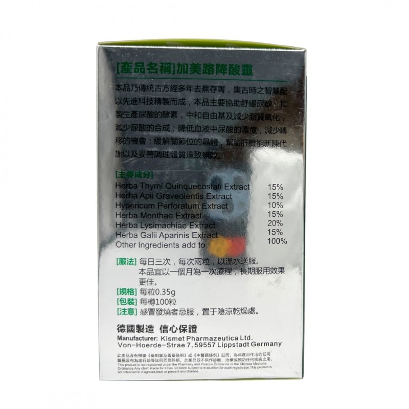 本品乃傳統古方經多年去蕪存菁,集古時之智慧配以先進科技精製而成,本品主要協助舒緩尿酸,抑制生產尿酸的酵素,中和自由基及減少脂質氧化,減少尿酸的合成;降低血液中尿酸的濃度,減少轉移的機會;緩解關節位的晶體,幫助肝機能新陳代謝以及妥善調理體質達至療效。每日三次,每次兩粒,以溫水送服。本品宜以一個月為一次療程,長期服用效果更佳。