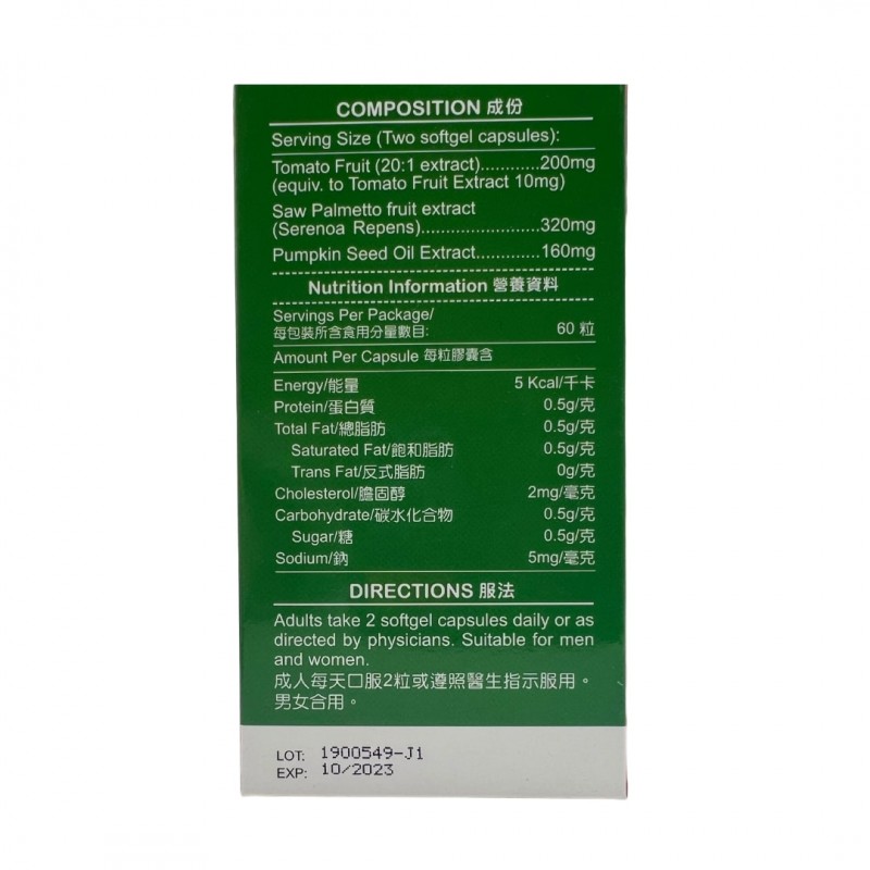男士恩物,固髓益精,保持腎氣充足,壯腰保腎,提升幹勁及精力。男女合用,緩減衰退,活髮抗氧。結合番茄紅素、鋸棕櫚精華及南瓜籽油三種強效草本精華。美國製造,過程符合GMP嚴格規定,品質保證。