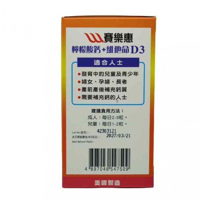 賽樂惠檸檬酸鈣+維他命D3(120粒)